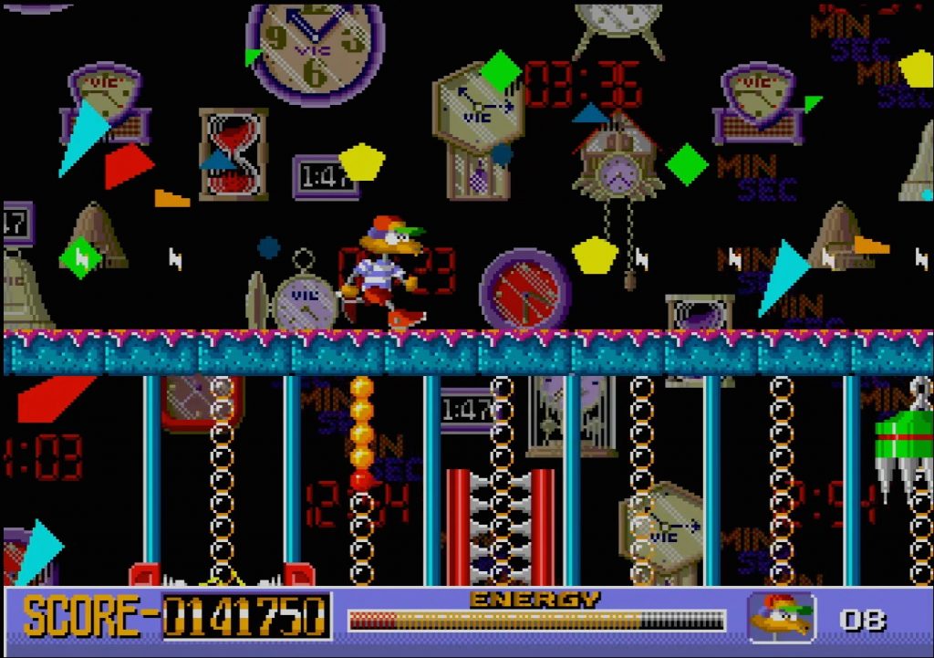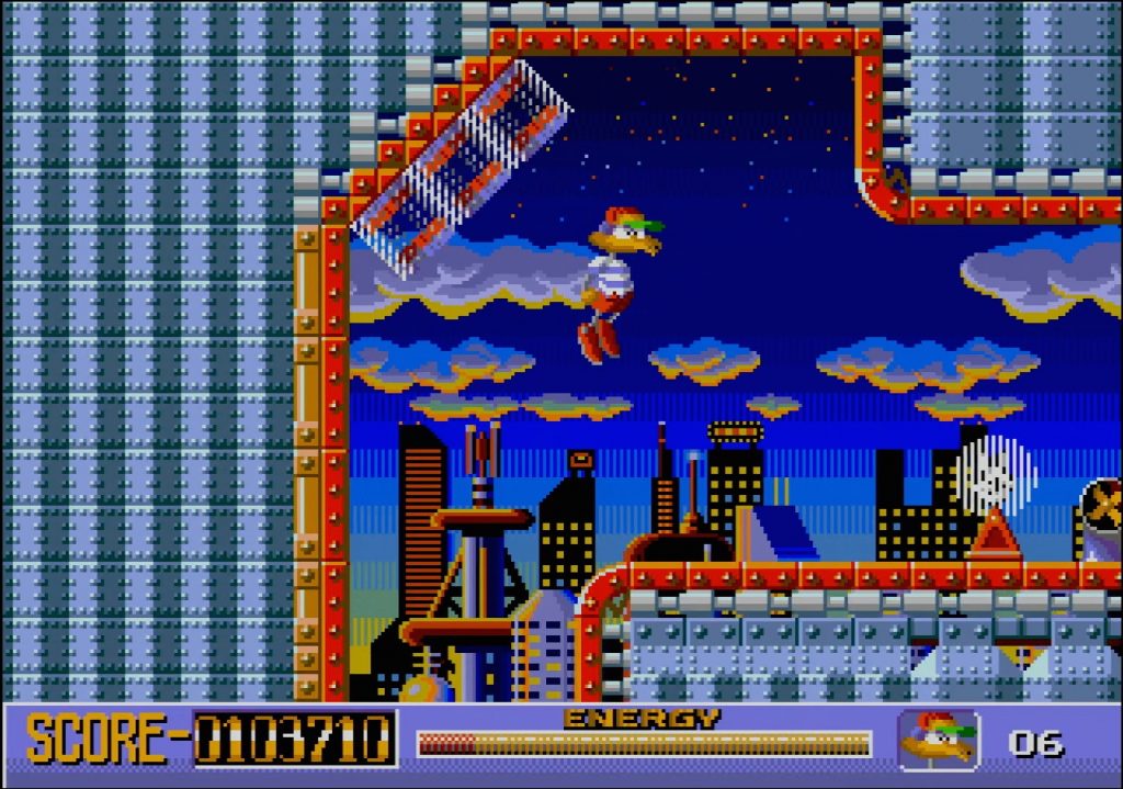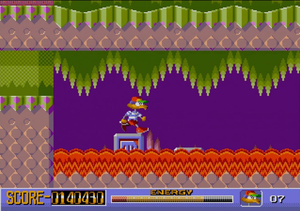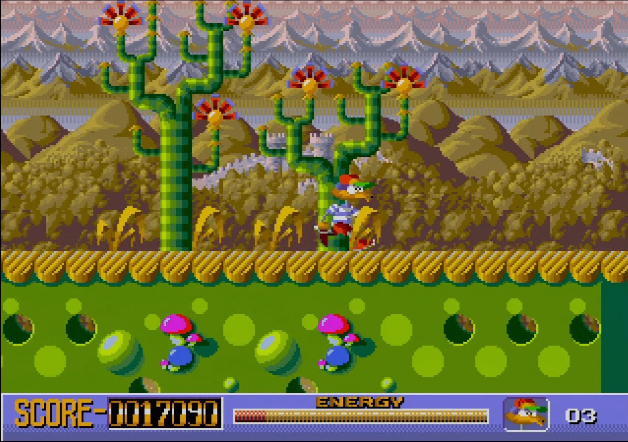 Realizing that there was a gap that needed to be filled, a company called Vic Tokai has decided to take advantage of this time between Sonic titles and create a mascot of their own. They needed a character that had that classic 90’s ‘tude and the ability to keep up with the blazing speed of Sonic. How about a Cheetah? They’re fast and always look like they’re pissed off. Nah, that’s too typical. Well, what about a coyote? They’re speedy and mean! Nah, coyotes are rather boring…and look too much like dogs. OK, well, what about a duck? Toshi-san, you’re a genius!